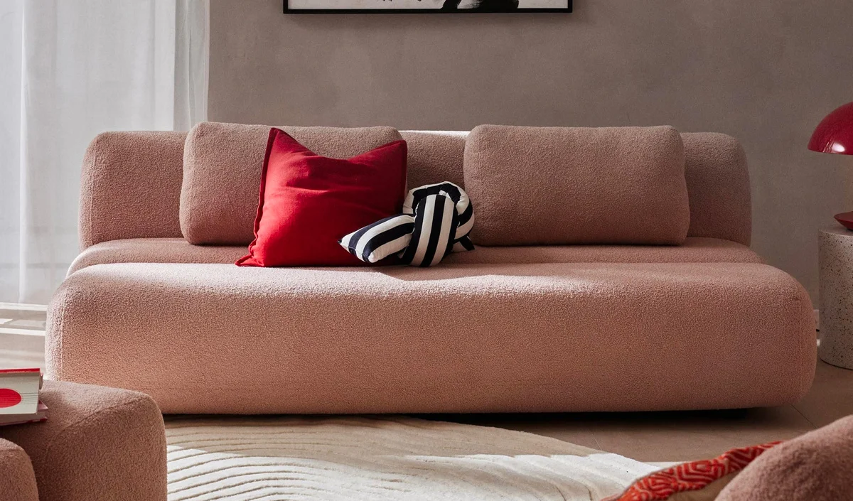 Un canapé convertible rose en tissu peluche pour un salon cocooning
