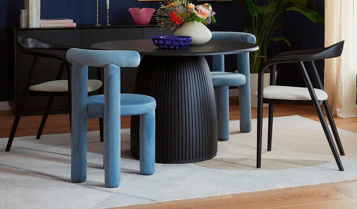 Je craque complètement pour cette chaise en velours bleu qui apporte une touche d’élégance immédiate à table.