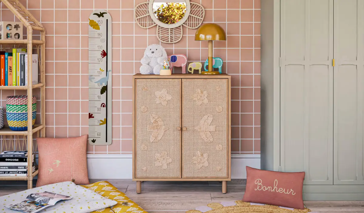 Ce qui rend cette tendance particulièrement réussie chez Maisons du Monde cette saison, c’est la qualité d’exécution des matières naturelles. Le rotin et le bambou ne sont pas traités comme de simples matériaux d’appoint — ils structurent les pièces principales, des bibliothèques aux dressings. Le résultat est une cohérence matière rare dans le mobilier enfant accessible, qui donne l’impression d’une chambre pensée et construite avec soin.