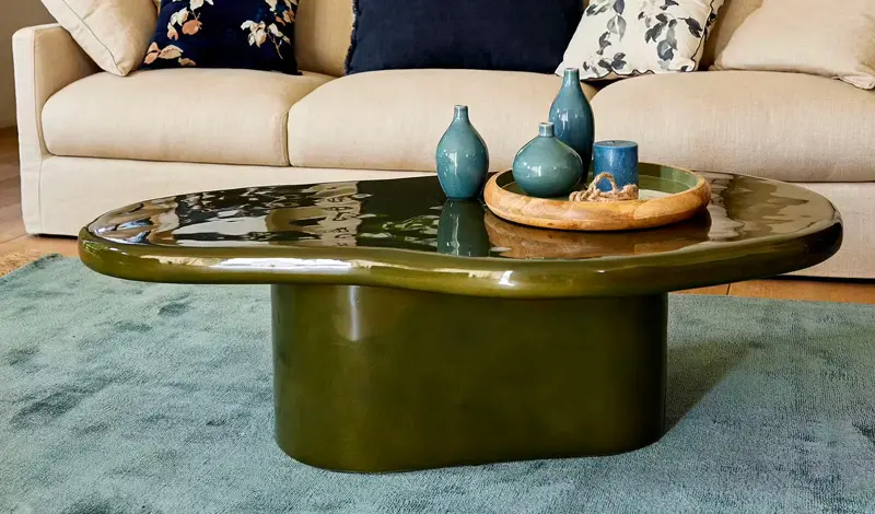 Vous aimez les pièces qui sortent de l’ordinaire ? La table basse organique en béton vert ne laissera personne indifférent. Avec ses courbes irrégulières et sa teinte minérale audacieuse, elle incarne parfaitement l’esprit design du moment, entre naturel et modernité assumée.