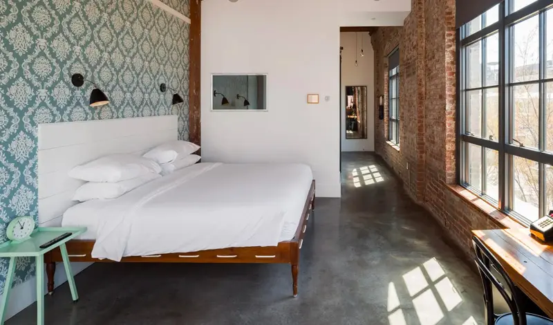 C’est dans un ancien bâtiment industriel de Williamsburg construit en 1901 que The Wythe Hotel a été aménagé. Cet hôtel de 70 chambres propose un décor à la fois brut et élégant qui donne le sentiment d’être dans un véritable loft au coeur de Brooklyn. Je vous propose de le découvrir en détails ci-dessous !